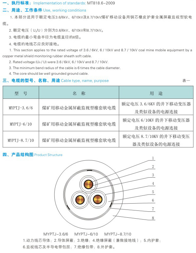 額定電壓8.7/10kV及以下移動(dòng)金屬屏蔽監(jiān)視型軟電纜
